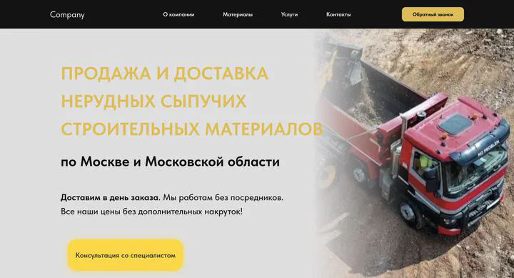 A clean, mobile-friendly landing page for a construction supplier offering fast delivery of bulk materials like sand, gravel, and more.
